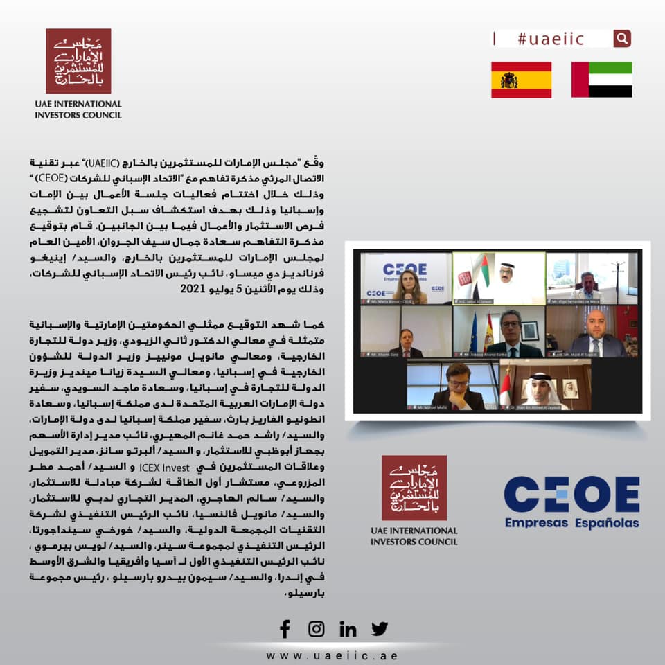 وقّع "مجلس الإمارات للمستثمرين بالخارج (UAEIIC)" عبر تقنية الاتصال المرئي مذكرة تفاهم مع الاتحاد الإسباني للشركات (CEOE). وذلك خلال اختتام فعاليات جلسة الأعمال بين الإمات وإسبانيا وذلك بهدف استكشاف سبل التعاون لتشجيع فرص الاستثمار والأعمال فيما بين الجانبين. قام بتوقيع مذكرة التفاهم سعادة جمال سيف الجروان، الأمين العام لمجلس الإمارات للمستثمرين بالخارج، والسيد/ إينيغو فرنانديز دي ميساو، نائب رئيس الاتحاد الإسباني للشركات، يوم الأثنين 5 يوليو 2021.