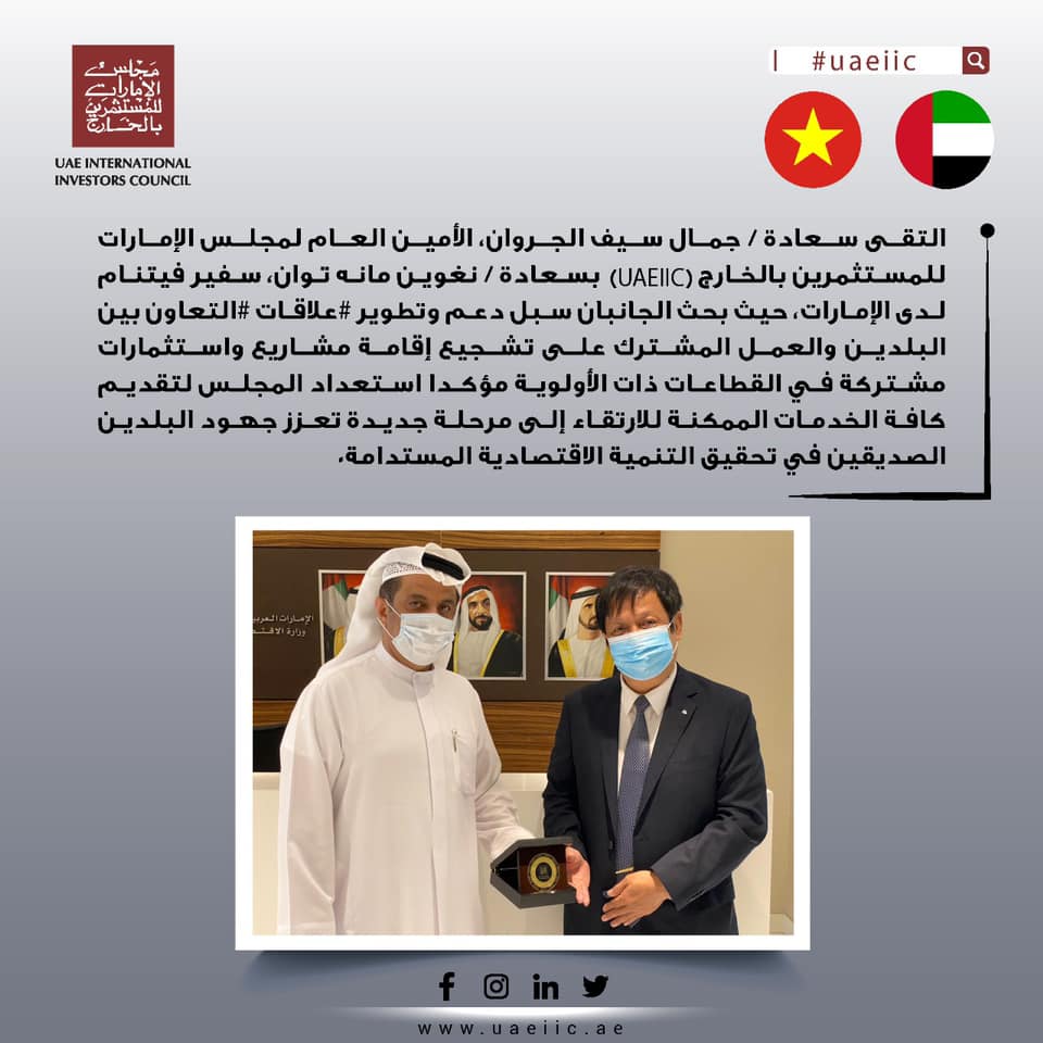 التقى سعادة / جمال سيف الجروان، الأمين العام لمجلس الإمارات للمستثمرين بالخارج بسعادة / نغوين مانه توان، سفير فيتنام لدى الإمارات، حيث بحث الجانبان سبل دعم وتطوير #علاقات #التعاون بين البلدين والعمل المشترك على تشجيع إقامة مشاريع واستثمارات مشتركة في القطاعات ذات الأولوية مؤكدا استعداد المجلس لتقديم كافة الخدمات الممكنة للارتقاء إلى مرحلة جديدة تعزز جهود البلدين الصديقين في تحقيق التنمية الاقتصادية المستدامة.